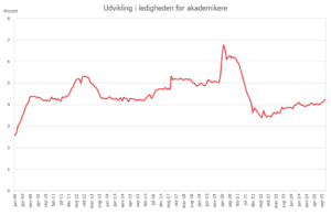 Ledigheden for akademikere ligger forholdsvis uændret omkring de 4 pct. i november 2025. Siden stigningen pga. coronanedlukningerne i 2020 og et efterfølgende dyk, har ledigheden ligget på omkring 4 pct. de seneste par år.